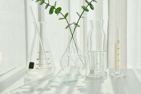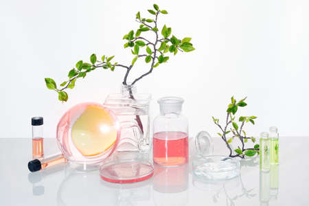 Natural drug research, Plant extraction in scientific glassware, Alternative green herb medicine, Natural organic skincare beauty products, Laboratory and development concept.
