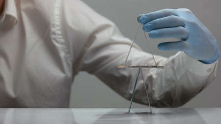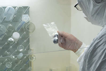 A forensic medical expert leading a criminal investigation, a specialist in laboratory research. He holds a test tube with a dna sample in hand. The paternity test. Test tubes in a chemical laboratory