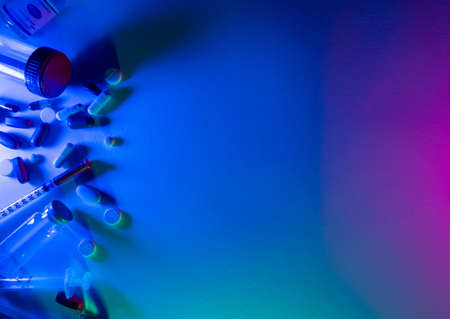 Covid-19 medication. Neon background. Pharmaceutical manufacture. Color light vaccine bottle dose syringe pills test tube composition on dark blue pink glow copy space.
