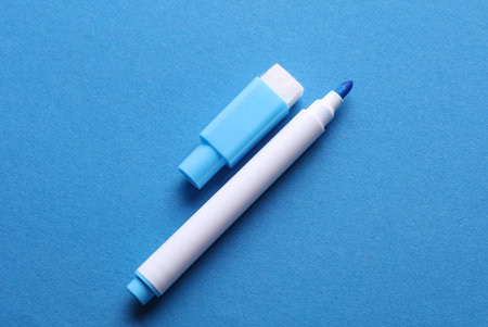 School stationery and supplies on a blue background with space for caption. Back to school, homeschool creative workspace. Minimalistic set of colorful stationery. Flat lay