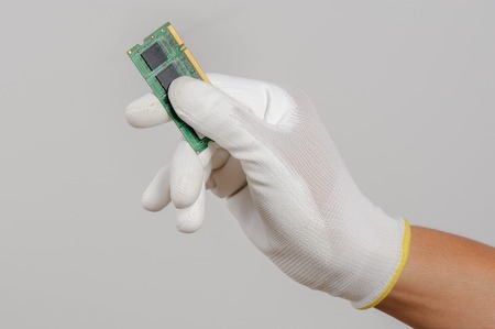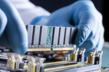 Close-up of technician hand with gloves installing ram memory slot