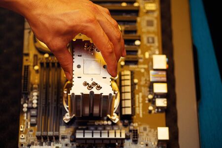 Man engineer,collector.Independent self computer assembly. Mounting in sockets processor,random access memory RAM,motherboard,fan. Assembly of home crypto farm.Generating tokens,cryptocurrency mining.