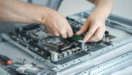Closeup of hands of a technician repairing a computer motherboard. A small computer controlled industrial machine, operated by a human hand, AI Generated