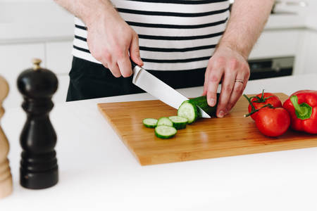 Close up of hands of caucasian man cooking a nice healthy vegetable meal or salad in a modern kitchen with a knife