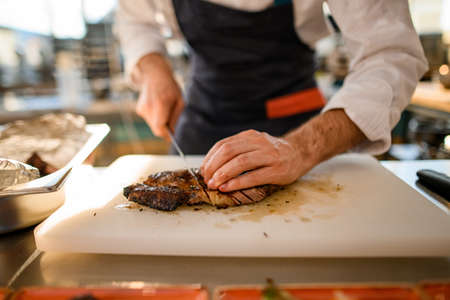 Male chef cutting big piece of beef on wooden board in restaurant kitchen.