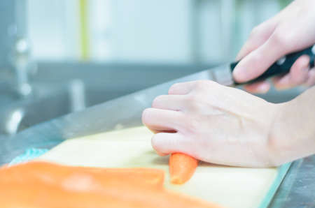 chef cuts carrot with a sharp knife