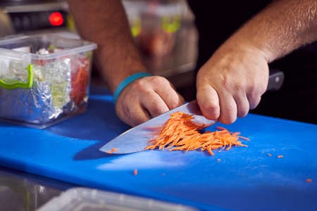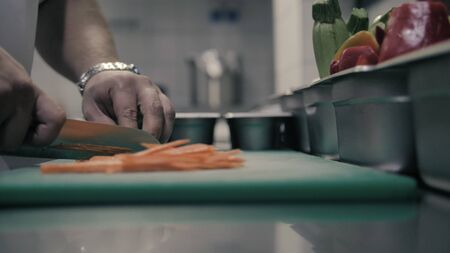 Chef cutting carrot with skillfully and cutting fast