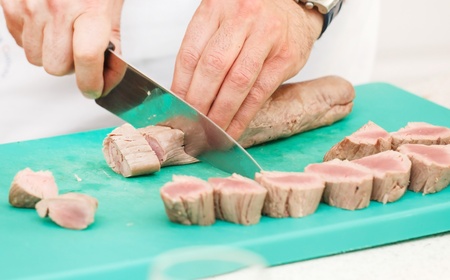 The cook cuts a piece of pork into steaks.
