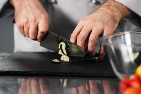 Male chef cutting fresh vegetable. Closeup chef hands with knife slicing cucumber at kitchen restaurant. Professional cooker in uniform cutting vegetable.