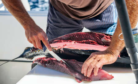Fisherman's hands with knife when processing tuna meat after fishing. Preparation of seafood from the balik of freshly caught yellowfin tuna on board fishing yacht at sea.