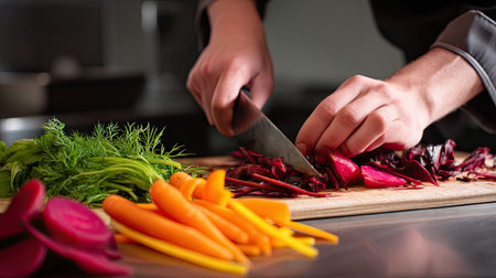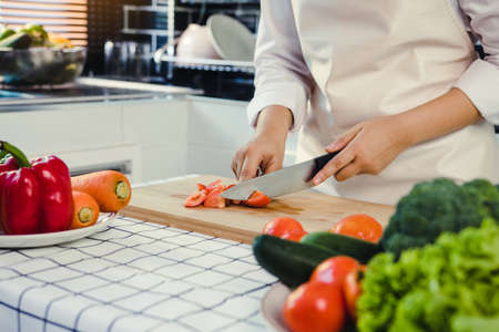 Chef cutting fresh and delicious vegetables for cooking