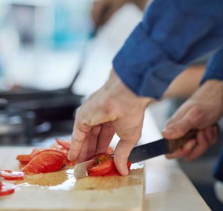 Chef cut tomato on cutting board with knife