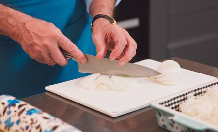 The chef in the kitchen cuts freshly onions for preparing chicken dish