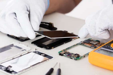 Phone repair concept a repairman picking the electronic part to assemble with the mobile phone with the tools on the desk.