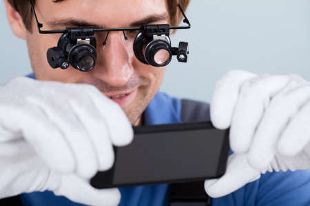 The repairman uses a magnifying glass to carefully inspect the internal parts of the smartphone in a modern repair shop. Illumination with red and blue lights