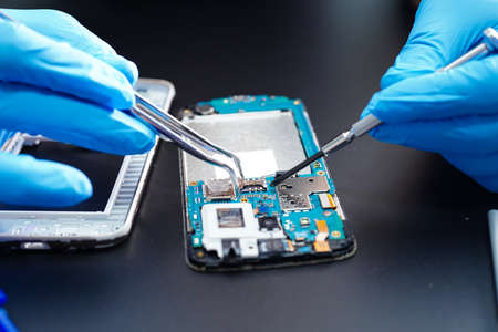 A closeup shot of a person repair a mobile in mobile repair smartphone workshop