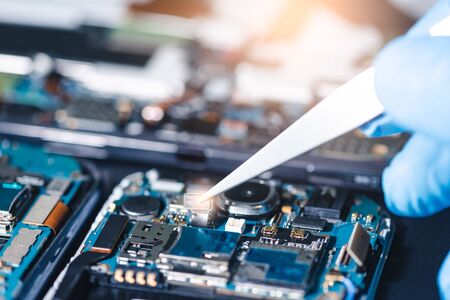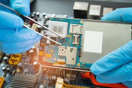 Technician repairing the smartphone's motherboard in the lab. Showing process of mobile phone repair.
