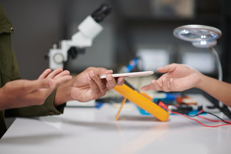 Hands of man giving repairing service manager his broken phone and asking to find issue and fix it