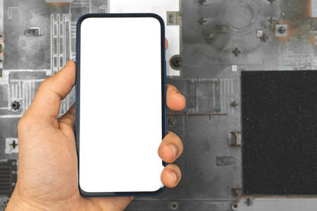 Mockup mobile phone on a background of computer and parts, repair concept template with copy space