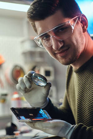 Electronic technician mending a broken tablet carefully examines the chip of the tablet using a magnifying glass in a repair shop. Illumination with red and blue lights
