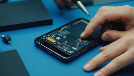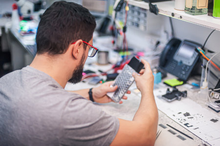 A perform technicians phone repair and battery replacement in a well-equipped workshop, focusing on the device with precision.