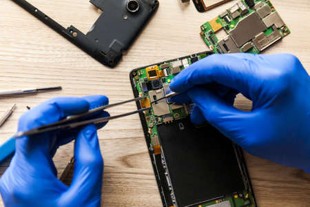 Smartphone repair. A telephone repairman holds a pair of tweezers with a camera in his hand, against the background of an unassembled mobile phone