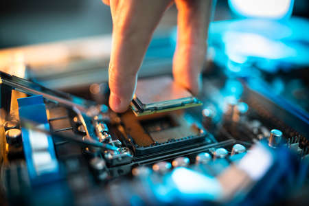 Engineer repairman holding chip CPU to insert into the socket of the computer motherboard. Concept of technology hardware.
