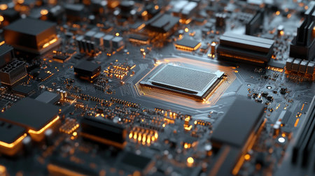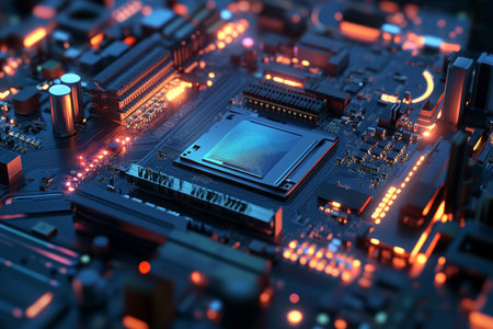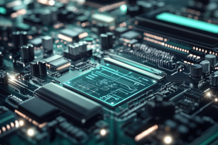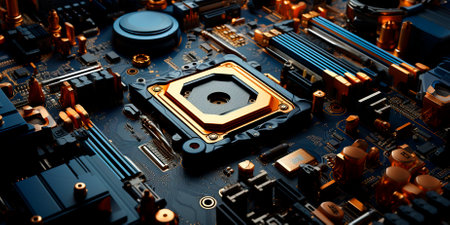 Detailed circuitry features numerous electronic components and glowing elements in a high-tech design.