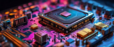 Computer motherboard background with blur neon multicolor glow, pc backdrop, close up