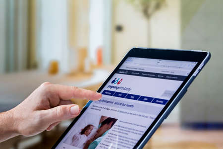 Paris, France - Apr 16, 2020: Woman looking on Apple Computers internet website on iPad Pro tablet in room environment showcasing new iPhone SE with question why its worth upgrading to new phone