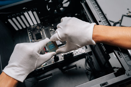 Closeup of computer technician wearing protective gloves positioning microprocessor onto electronic circuit board, demonstrating professional hardware maintenance and intricate technical assembly.