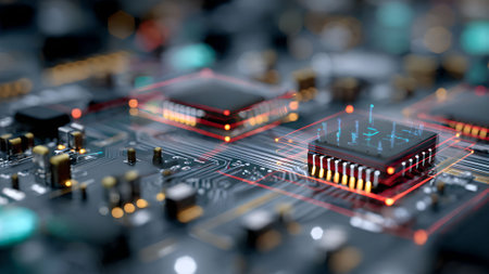 Futuristic circuit board with glowing microchip in high-tech environment.