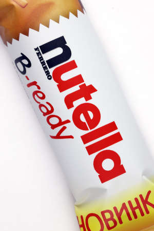 KHARKIV, UKRAINE - DECEMBER 16, 2021: Bar of Nutella B-ready crunchy wafer shell filled with creamy Nutella and sprinkled with puffed wheat crisps