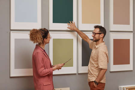 Young designer pointing at pictures on the wall and discussing them with his colleague at art gallery