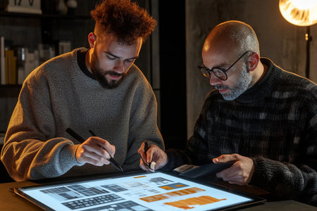Two colleagues engage in a dynamic brainstorming session, using a digital tablet to outline their business plan. The modern setting enhances their creative collaboration and focus.