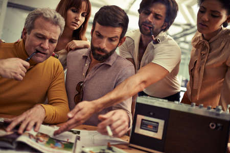 Diverse group of happy business colleagues brainstorming pointing at photos in meeting room. independent creative business in modern office.