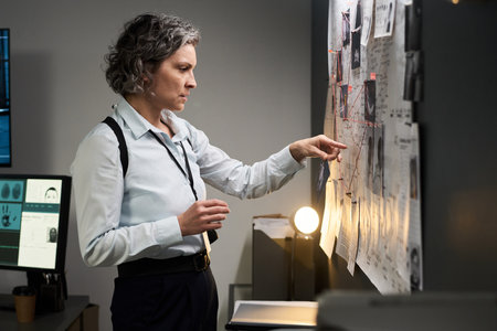 Female detective with short hair analyzing crime scene evidence on bulletin board in office environment