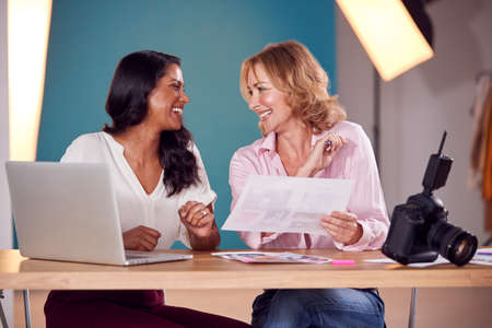 Mature Female Fashion Photographer With Assistant Looking At Brief For Fashion Shoot In Studio