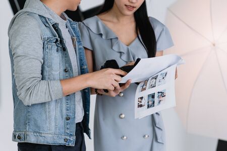 Photographer and Asian model talking to each other about concept of their work with studio strobe in background