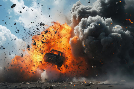 An intense explosion erupts generating a large cloud of dust and debris against a dark background illustrating the force of the blast and its impact on the environment.