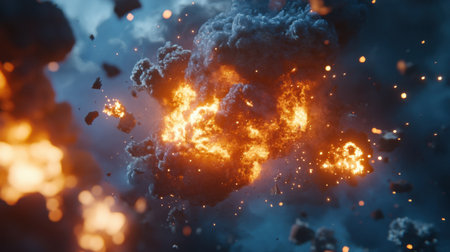 explosion happens in a dark sky sending smoke and debris into the air. The blast creates a large fireball and shockwave that spreads outwards. Dust and particles fill the scene.