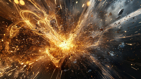 A dynamic explosion dominates the frame, showcasing a central cloud of smoke and radiating bursts of energy. The composition features contrasting colors of dark blue and bright gold, suggesting a powerful event. Suitable for illustrating concepts such as force, destruction, or impact, it is ideal for commercial applications.