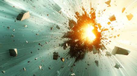 Abstract geometric explosion with polygon debris flying outward