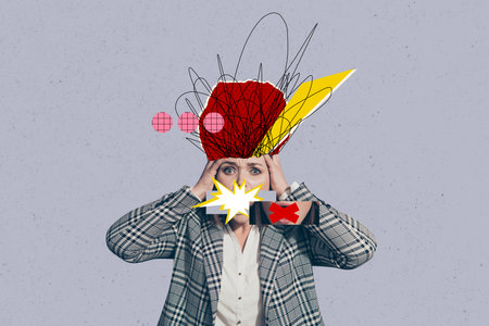 Photo collage creative picture young woman mind mess chaos drawing doodles stupor panic overworked workaholic mental problem