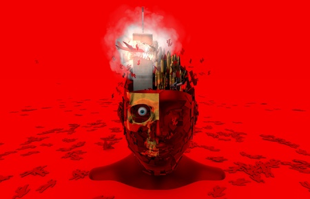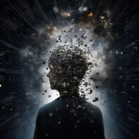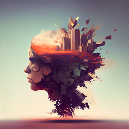 A surreal representation of a humanoid figure with a fragmented head, depicting emotions and thoughts merging.