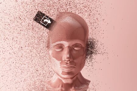 Abstract human head with dispersion effect on face. Overthinking and complexity concept. This is a 3d render illustration