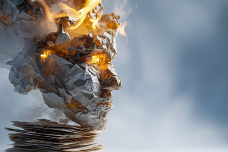 A striking artwork featuring a fiery, deformed paper visage with luminous eyes and flickering flames, set against a gentle blue backdrop symbolizing passion and introspec