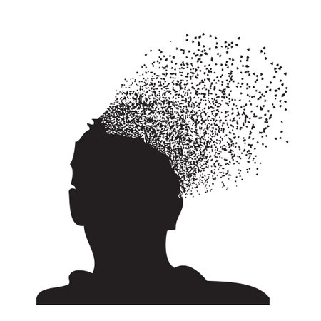 Profile of a head disintegrating into particles against dark backdrop. Concept of digital transformation, data visualization, Artificial intelligence, and innovation.