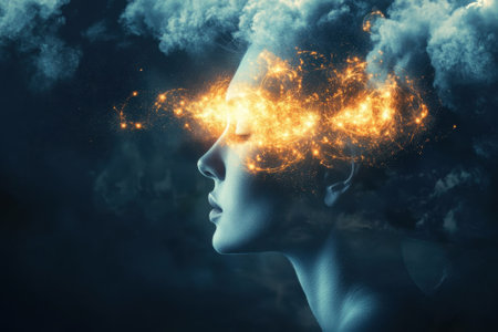 Conceptual image of a woman s head with lightning and fire representing mental turmoil and emotions