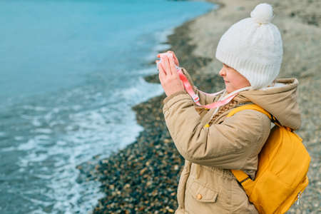 Take a mobile picture on your phone seashore. Female hands hold the phone and take pictures. Travel photography.